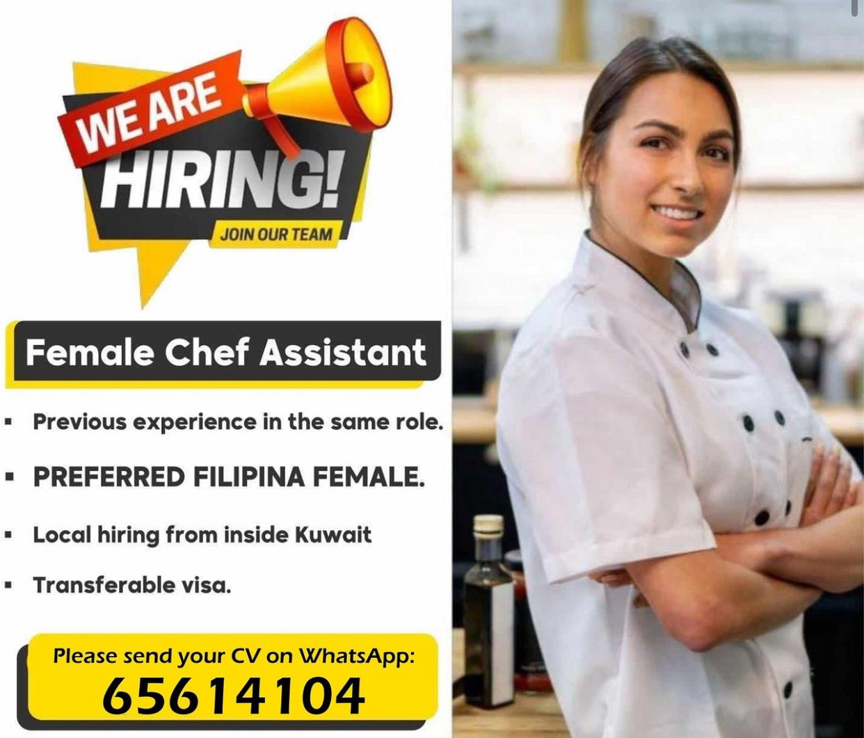 WE ARE HIRING! JOIN OUR TEAM Female Chef Assistant • Previous experience in the same role. • PREFERRED FILIPINA FEMALE. • Local hiring from inside Kuwait • Transferable visa. Please send your CV on WhatsApp: 65614104