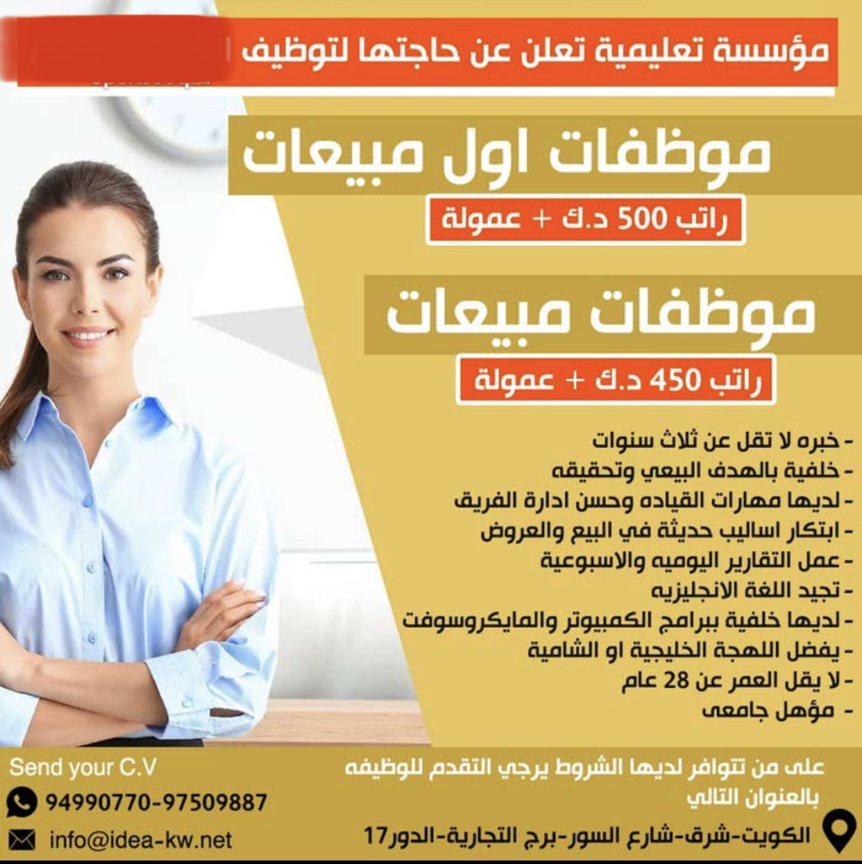 مطلوب موظفات مبيعات لديها خبرة بالبيع والترويج للخدمات والمنتجات لديها القدرة علي الاقناع والاتفاق وعمل تقارير يومية واسبوعية وابتكار اساليب حديثة في البيع راتب 450 +عمولة
