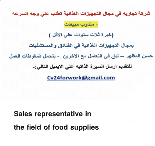 Urgent Required Sales Representative A trading company in the field of foodstuffs Request a sales representative at least three years experience in the field of catering in hotels Please Send Cv Cv24forwork@gmail.com 66155474