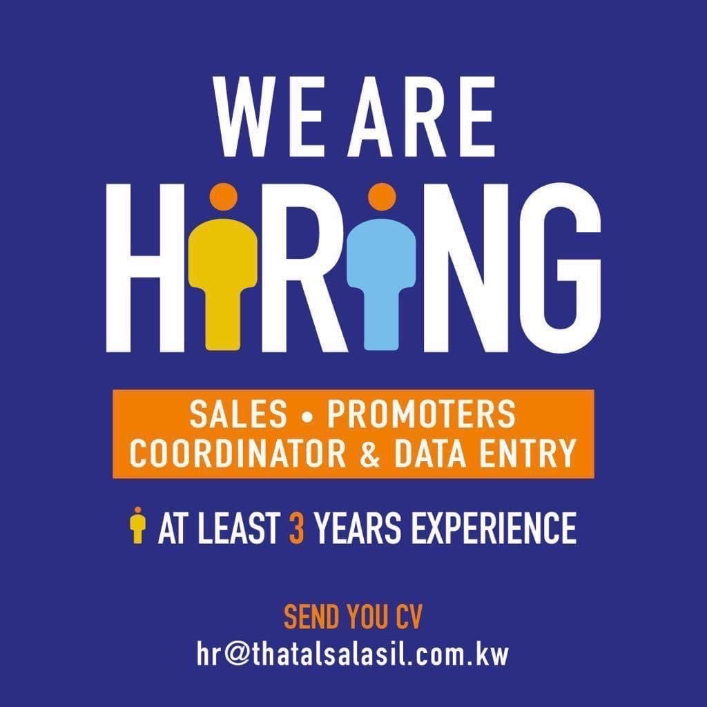 WE ARE HiRiNG SALES • PROMOTERS COORDINATOR & DATA ENTRY † AT LEAST 3 YEARS EXPERIENCE SEND YOU CV hr@thatalsalasil.com.kw