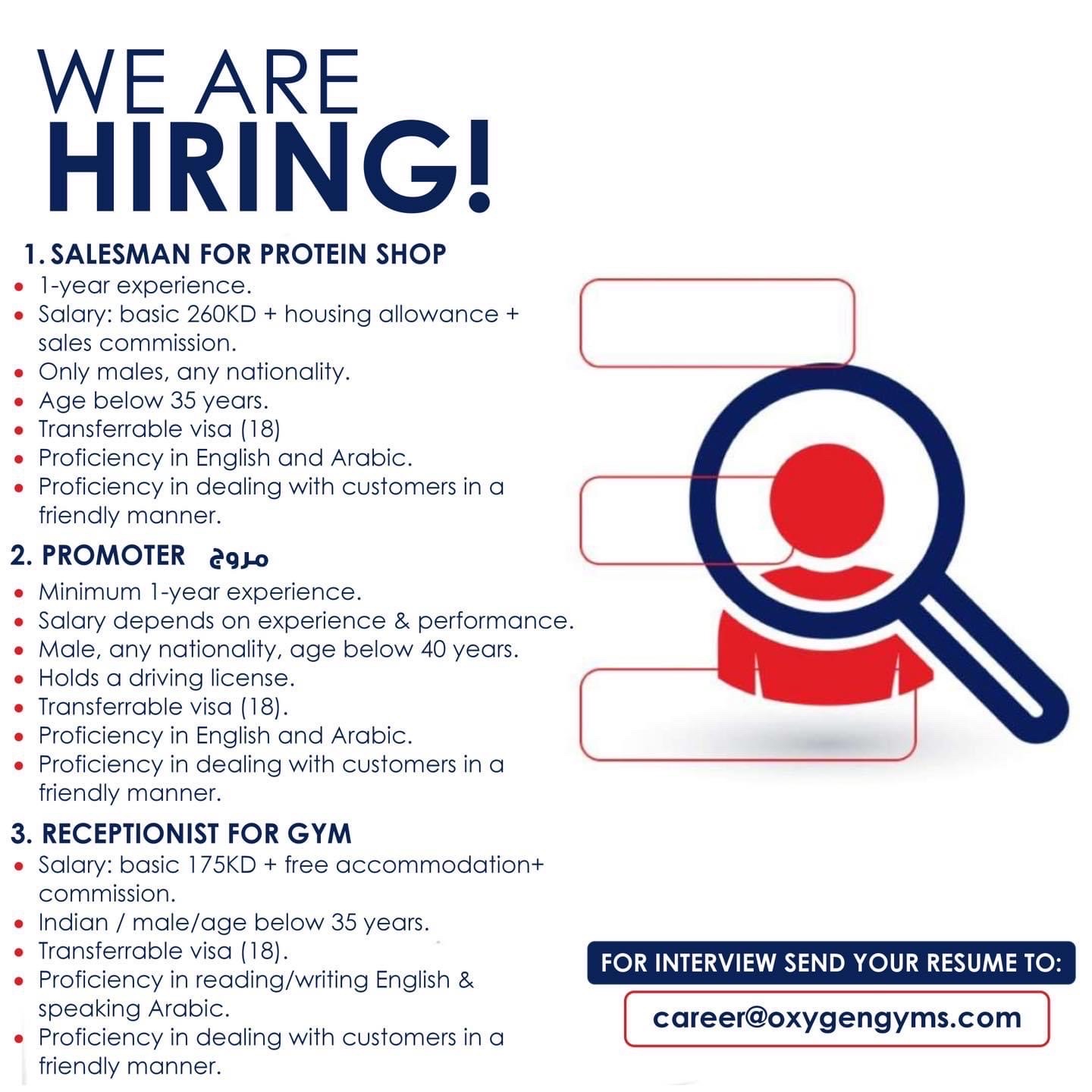 WE ARE HIRING! 1. SALESMAN FOR PROTEIN SHOP • I-year experience. • Salary: basic 260KD + housing allowance + sales commission. • Only males, any nationality. • Age below 35 years. • Transferable visa (18) • Proficiency in English and Arabic. • Proficiency in dealing with customers in a friendly manner. 2. PROMOTER 29 o • Minimum 1-year experience. • Salary depends on experience & performance. • Male, any nationality, age below 40 years. • Holds a driving license. • Transferrable visa (18). • Proficiency in English and Arabic. • Proficiency in dealing with customers in a friendly manner. 3. RECEPTIONIST FOR GYM • Salary: basic 175KD + free accommodation+ commission. • Indian / male/age below 35 years. • Transferrable visa (18). • Proficiency in reading/writing English & speaking Arabic. • Proficiency in dealing with customers in a friendly manner. FOR INTERVIEW SEND YOUR RESUME TO: career@oxygengyms.com