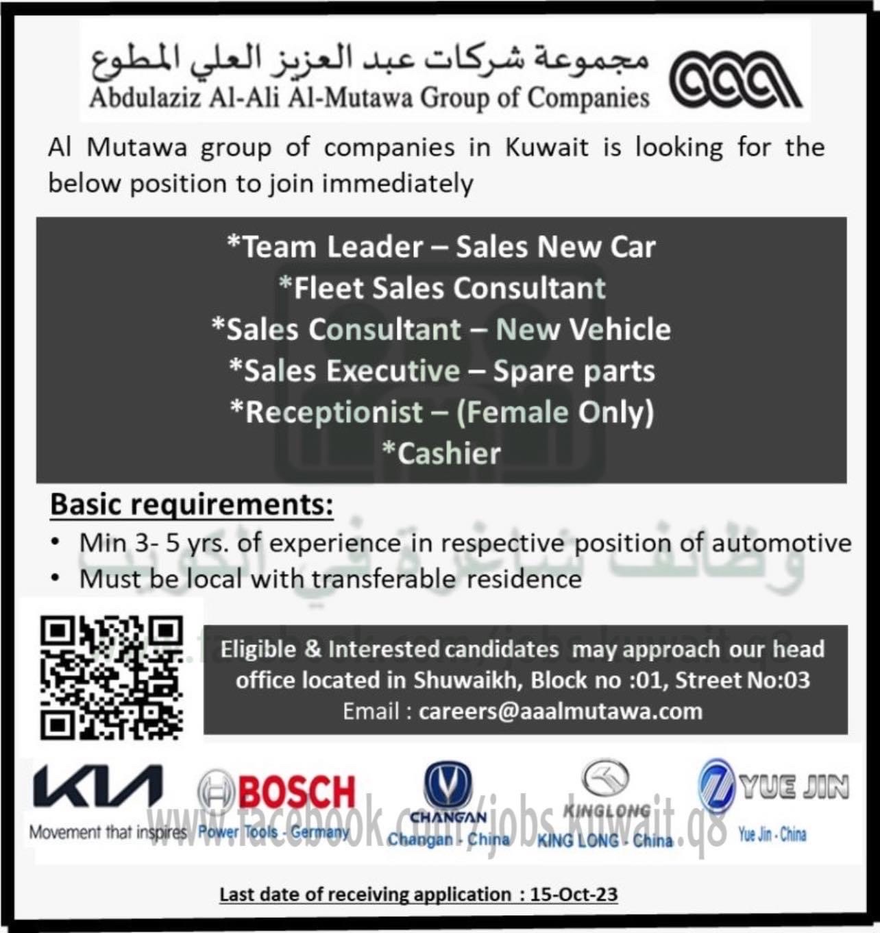 Abdulaziz Al-Ali Al-Mutawa Group of Companies Al Mutawa group of companies in Kuwait is looking for the below position to join immediately *Team Leader - Sales New Car *Fleet Sales Consultant *Sales Consultant - New Vehicle *Sales Executive - Spare parts *Receptionist - (Female Only) *Cashier Basic requirements: • Min 3-5 yrs. of experience in respective position of automotive • Must be local with transferable residence Eligible & Interested candidates may approach our head office located in Shuwaikh, Block no :01, Street No:03 Email: careers@aaalmutawa.com КИ # BOSCH Movement that inspires, Rower Tools Germany CHANGAN Changan - China YUE DIN KING LONG. China. 0 Yue Jin • China Last date of receiving application: 15-Oct-23