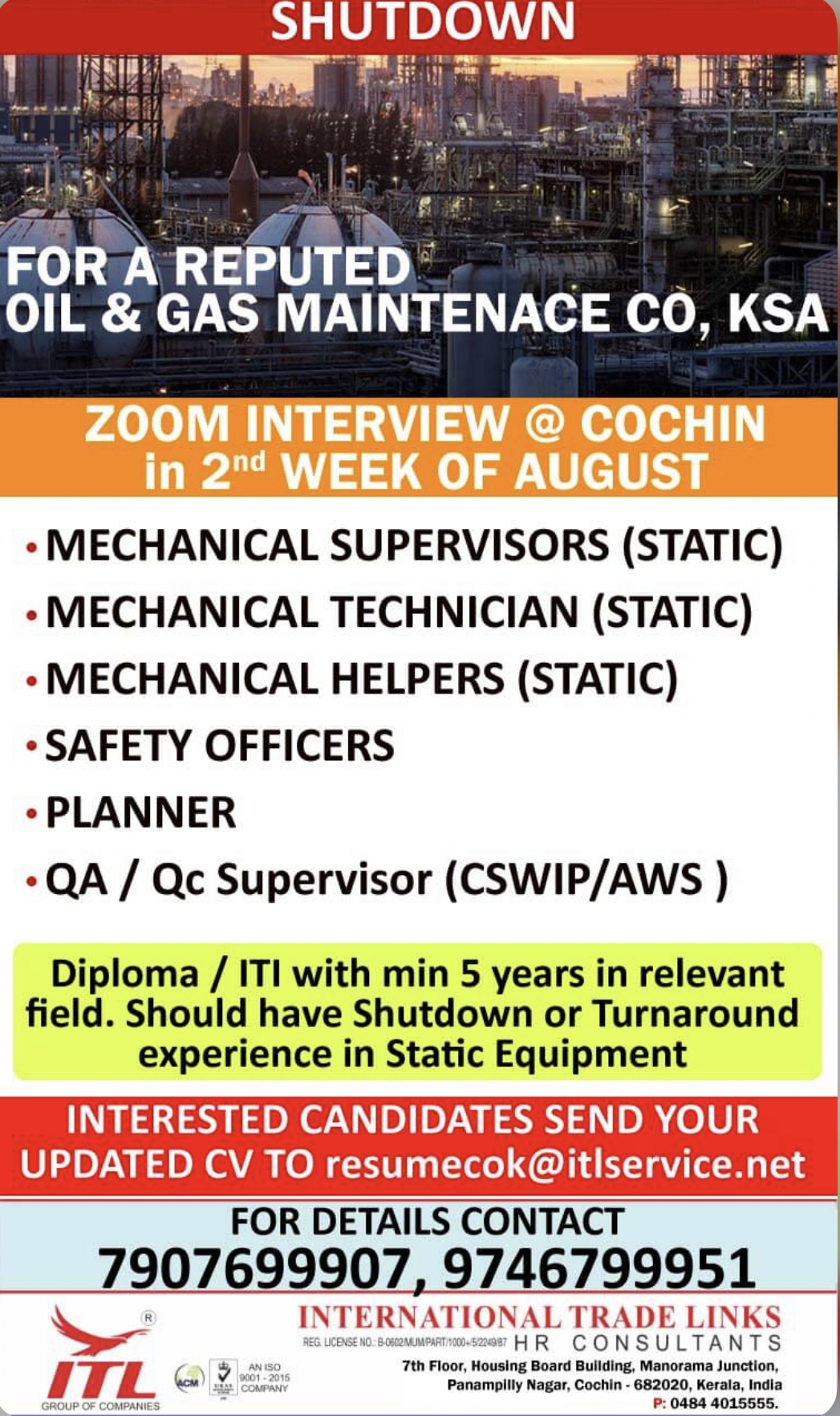 Required for Saudi Arabia For Reputed Oil and Gas Maintenance Mechanical supervisor Mechanical Technician Mechanical Helpers Safety Officers Planner QA/ Qc supervisor Contact 7907699907